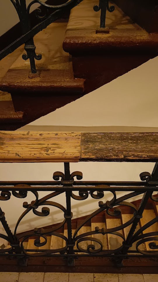В доме на Садовнической 66 хорошо сохранились исторические деревянные поручни. Жители их берегут и не дают разрешения ни на какие работы с ними при текущих ремонтах. Мы помогаем очистить поручни от краски, а затем покроем лаком, чтобы вернуть им былой облик.